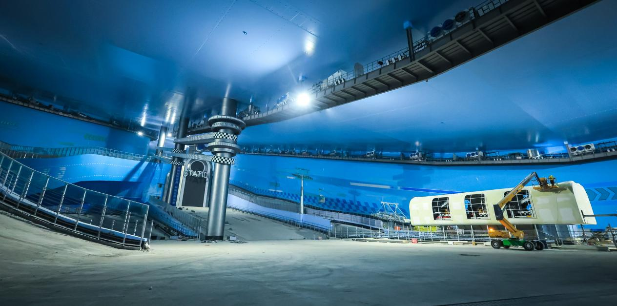 盡管室內(nèi)滑雪場仍在施工中,但嶄新的雪具大廳已經(jīng)進入裝修的最后階段,分布在墻上和頂棚的藍色光帶營造的雪花造型,給人以強烈的視覺沖擊。進入到滑雪場內(nèi)部,四條不同等級的雪道顯露真容,拖掛式纜車的核心設備已安裝到位,空中纜線基本鋪設完成。