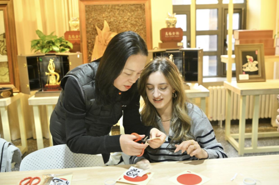 美國(guó)自媒體博主于中美按照吉林省查干湖魚(yú)皮制作技藝傳承人徐毳的指導(dǎo),一步步剪完了魚(yú)皮畫(huà),她舉著自己的作品說(shuō):“我是第一次了解魚(yú)皮畫(huà),沒(méi)想到魚(yú)皮能做成這么精美、這么美麗的藝術(shù)品!