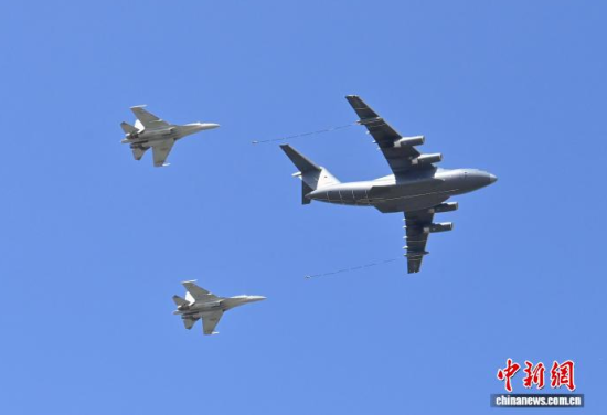 9月16日,吉林長春,運(yùn)油-20A(右一)與殲-16雙機(jī)編隊(duì)通場。 張瑤 攝