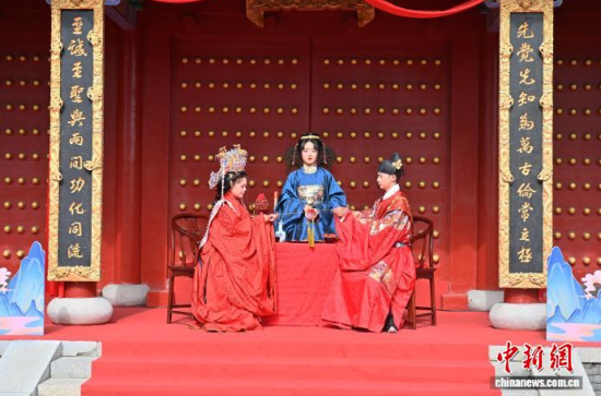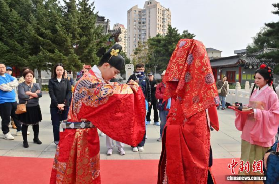 10月7日,吉林長(zhǎng)春文廟舉行了一場(chǎng)明制漢婚沉浸式展演。漢服愛好者依次呈現(xiàn)奠雁、同牢、合巹等傳統(tǒng)禮儀,生動(dòng)還原明代婚俗,F(xiàn)場(chǎng)通過流程講解與道具展示,解讀禮儀背后古人對(duì)婚姻與美好生活的寄愿。中新社記者 張瑤 攝